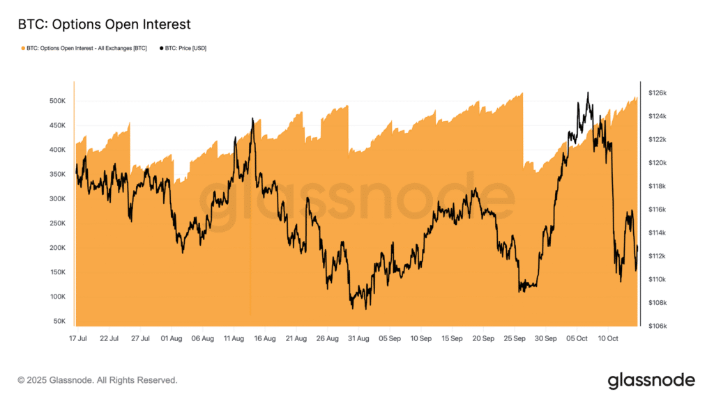 Wskaźnik tzw. Open Interest (OI) dynamicznie rośnie w pobliże ATH. Podczas gdy rynek futures przeszedł głębokie delewarowanie, uwaga inwestorów przeniosła się na rynek opcji. Tam aktywność odbudowała się zaskakująco szybko. Po dużym wygaśnięciu kontraktów z 26 września otwarte pozycje na opcjach Bitcoina potrzebowały niewiele czasu, by ponownie wzrosnąć niemal do historycznych maksimów.