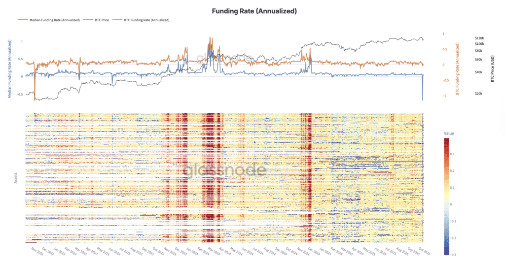 Po historycznym oczyszczeniu dźwigni napięcie na rynku futures jeszcze się pogłębiło, gdy stopy finansowania spadły do poziomów niewidzianych od kryzysu FTX pod koniec 2022 roku. Na rynku kontraktów perpetual w ujęciu rocznym gwałtownie spadły poniżej zera, co pokazuje, że traderzy płacili premię, by utrzymać krótkie pozycje po tym, jak bycza dźwignia została zlikwidowana.