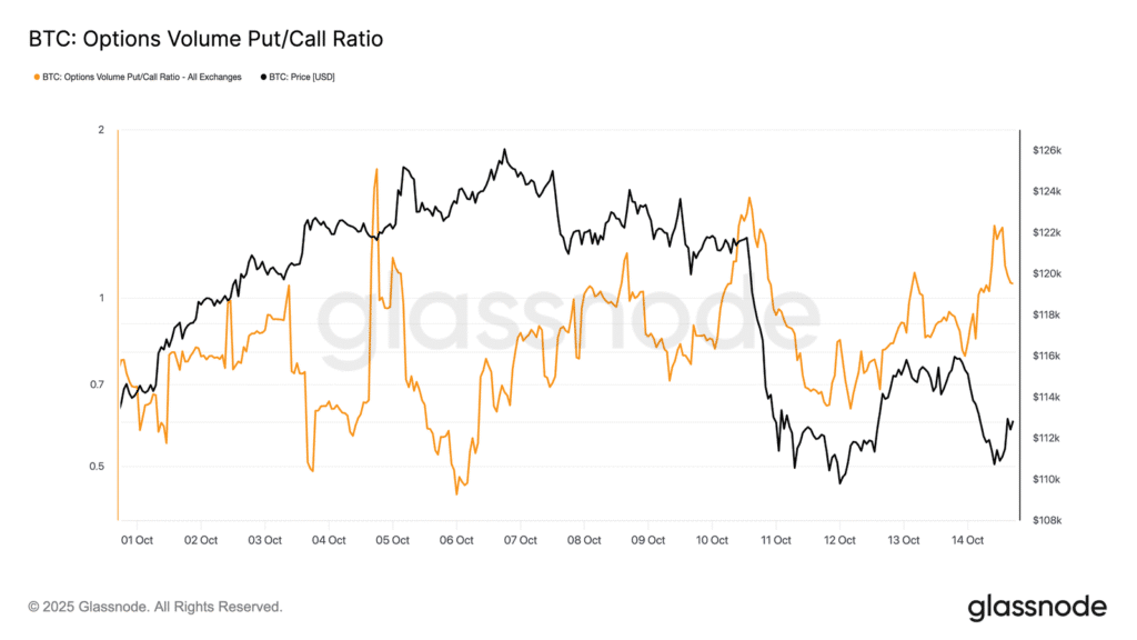 Tuż przed gwałtownym spadkiem rynku wskaźnik put/call volume ratio — mierzący relację wolumenu opcji sprzedaży do kupna — poszybował w górę, sygnalizując rosnące napięcie wśród uczestników rynku. W piątek, gdy Bitcoin utrzymywał się w okolicach 121,7 tys. USD, wskaźnik przebił poziom 1,0, kończąc dzień na 1,41 i osiągając chwilowy szczyt w pobliżu 1,51 — wobec około 0,8 na początku tygodnia.