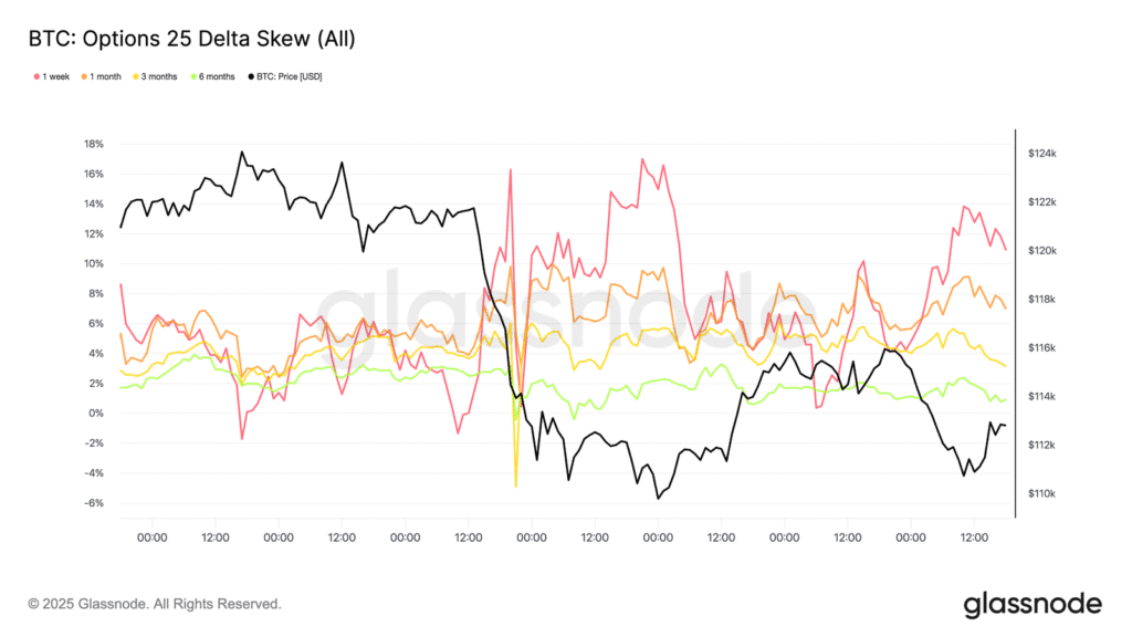 Po eksplozji zmienności uwaga inwestorów przeniosła się na strukturę skew, która wyraźnie odzwierciedliła ucieczkę uczestników rynku w kierunku ochrony kapitału. 25-delta skew (liczony jako różnica między Put a Call) wystrzelił w górę we wszystkich terminach po największej w historii likwidacji na rynku opcji BTC, gdy popyt na zabezpieczenia przed spadkami gwałtownie wzrósł.