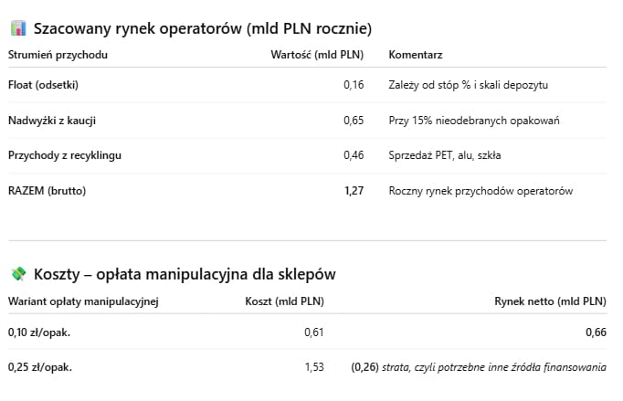 Zrobię to w formie przejrzystej tabeli – „mapa przychodów” dla operatorów systemu kaucyjnego w Polsce. Policzymy 3 źródła przychodów: