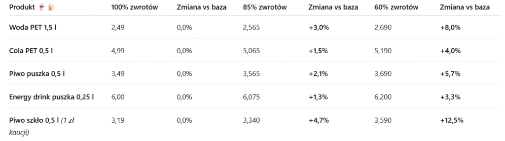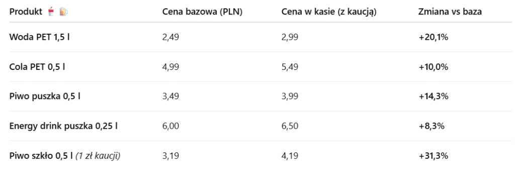 - Kaucja: 0,50 zł (PET, puszki), 1,00 zł (szkło).