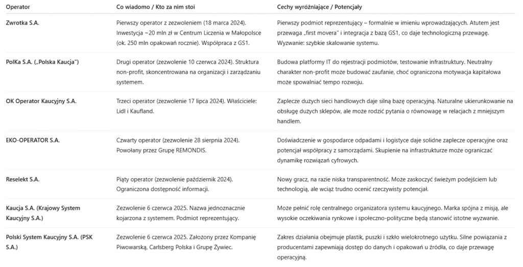 Niemniej jednak 'swoich operatorów’ (OK Operator Kaucyjny S.A.) mają już Schwarz Gruppe wspomniana wcześniej (właściciel Lidla, Kauflandu), czy Carslberg, Grupa Żywiec (właścicielem jest Heineken) i Kompania Piwowarska (właścicielem jest Asahi) – operator to Polski System Kaucyjny S.A; PSK S.A. Lista operatorów dostępna jest na gov.pl tutaj. Ale dlaczego niektóre spółki pospieszyły się, by stworzyć 'własnych’ operatorów?