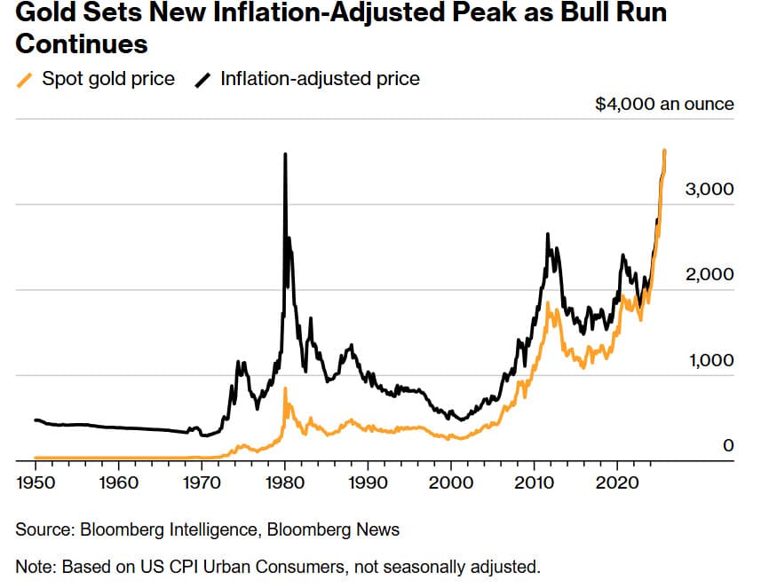 Cena złota wspięła się właśnie na poziomy, których jeszcze kilka lat temu nikt sobie nie wyobrażał. Kruszec skazywany był na pożarcie i słabość w relacji do szarżującego rynku akcji. 3674 dolary za uncję – to nie tylko nowy rekord nominalny, ale także historyczny szczyt po uwzględnieniu inflacji. Granica z 1980 roku, przez dekady uważana za symboliczny szklany sufit, została wreszcie przebita.
