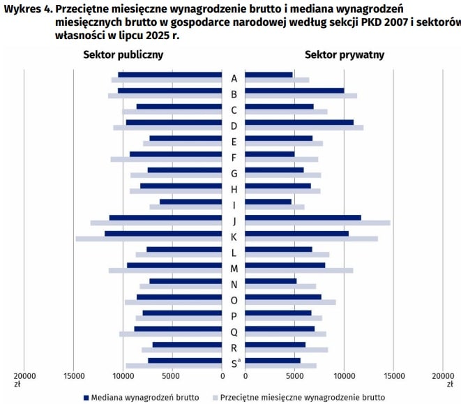 Przeciętne wynagrodzenie w gospodarce narodowej w lipcu 2025 r. wyniosło 8866,43. Pod tym względem zarobki w sektorze publicznym również okazały się wyższe niż w prywatnym. W sektorze publicznym wyniosło 9605,19 zł, co stanowiło 108,3% wartości ogółem. W sektorze prywatnym przeciętne wynagrodzenie było równe 8530,80 zł (96,2% wartości ogółem).