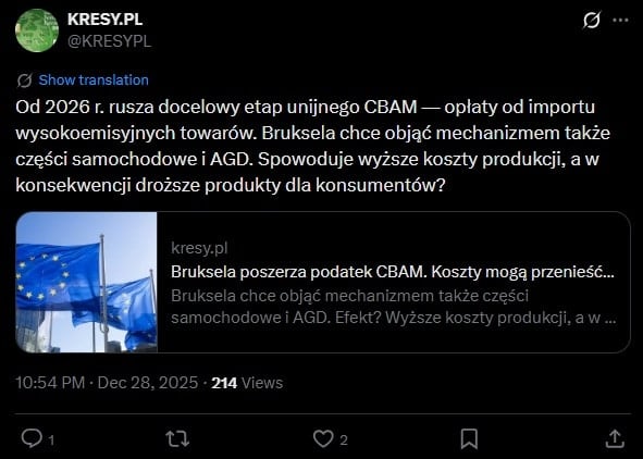 Niestety szykują się też podatki, które uderzą w znacznie szerszą grupę. Od nowego roku zacznie obowiązywać tzw. węglowy podatek graniczny (CBAM). Z założenia podatek ma uderzać w państwa o niższych standardach ekologicznych, jak Chiny i USA, to w praktyce uderzy w zwykłych obywateli.