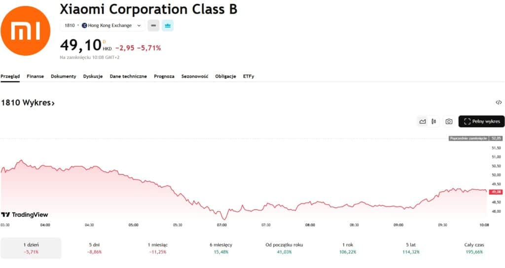 Po tym zdarzeniu akcje spółki na giełdzie w Hongkongu spadły w najgorszym momencie o 8,7%. To największy spadek akcji Xiaomi od kwietnia. W chwili pisania tekstu akcje firmy kosztują 49 HKD, a w ciągu ostatnich 24 godzin spadły o 5,71%. Natomiast przez ostatni tydzień i miesiąc spółka straciła odpowiednio 8,86% oraz 11,25%.