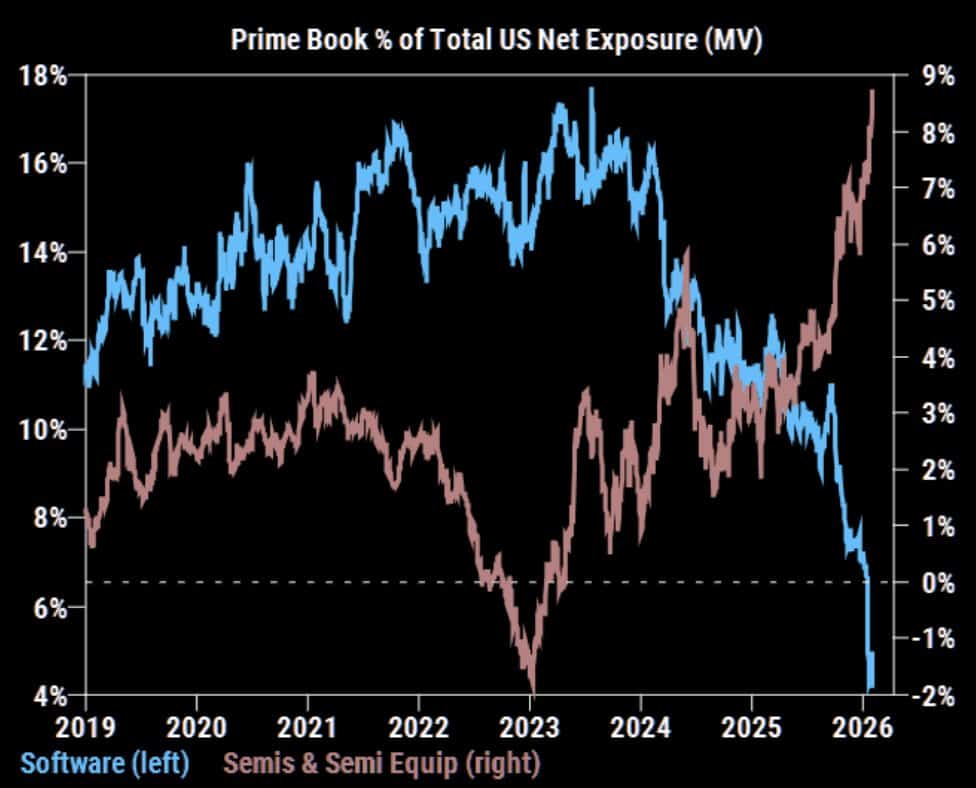 Narracja Morgan Stanley zaczyna się jednak przesuwać się w stronę szukania okazji. Bank wskazał listę akcji firm, które mogą skorzystać z nowych trendów w 2026 roku. W ostatnim czasie wg. danych Goldman Sachs fundusze spekulacyjne w rekordowej skali pozbywały się akcji firm z sektora software, na korzyść tzw. dostawców infrastruktury m.in. półprzewodników.