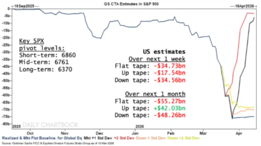 To jednak dopiero początek. Modele wskazują, że w najbliższym tygodniu fundusze systematyczne mogą sprzedać kolejne 70 miliardów dolarów w globalnych akcjach, a w horyzoncie miesiąca nawet 100 miliardów.