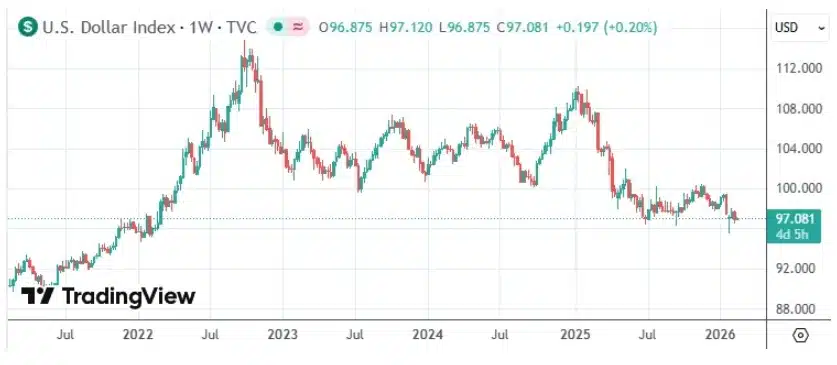 Niespokojne nastawienie zarządzających funduszami do dolara amerykańskiego wzrosło do najwyższego poziomu od ponad dekady. Indeks dolara amerykańskiego spadł o około 1,2% od początku roku. To efekt spadku dolara o ponad 9,4% w 2025 r. Zakłady rynkowe na słabszego dolara przewyższają obecnie pozycje bycze. Duże firmy zarządzające aktywami twierdzą, że spadek wartości dolara odzwierciedla chęć inwestorów do zabezpieczenia się przed ryzykiem dalszej deprecjacji.