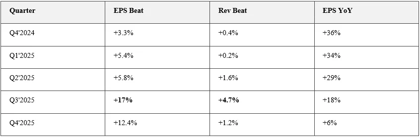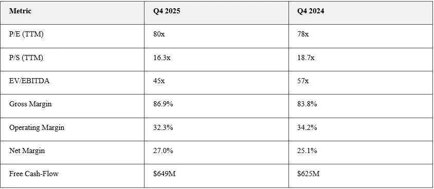 Problem nie leży jednak w jakości biznesu, tylko w cenie. Spółka wciąż handluje w okolicach 80x zysków, mimo że tempo wzrostu wyraźnie hamuje. Jeszcze niedawno EPS rósł w tempie ponad 30%, dziś bliżej mu do jednocyfrowych poziomów. Rynek zaczyna więc zadawać niewygodne pytanie: ile premium jest jeszcze uzasadnione, gdy dynamika już nie przyspiesza.