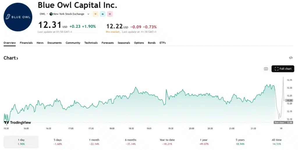 W momencie pisania tekstu akcje spółki kosztują 12,17 USD. Tylko w ciągu ostatniego miesiąca podmiot stracił ponad 22%. Od początku roku (Year To Date) Ble Owl spadł o 18%. Natomiast w ujęciu rocznym spółka straciła na wartości 49,07%.