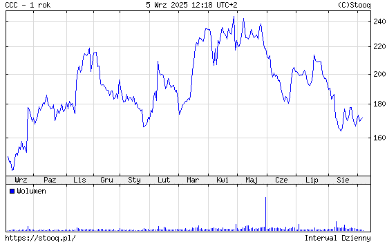 Wczorajsza sesja zamknęła się dla CCC z wynikiem 171 zł. Tymczasem wiosną br. było to ponad 240 zł. W szczycie za jedną akcję płacono przeszło 247 zł. W ciągu kilku miesięcy notowania spadły o niemal jedną trzecią. Oczywiście będą i tacy, którzy stwierdzą, że jesienią 2023 roku za jeden papier płacono mniej niż 40 zł, więc jeśli ktoś kupował walory w tamtym czasie, wciąż jest na pokaźnym plusie.
