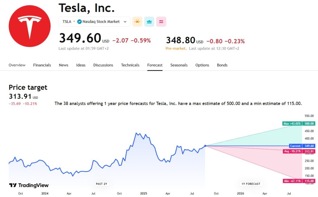 Najnowsza ankieta dotycząca prognoz dla TSLA, którą przeprowadzono wśród analityków z Wall Street, daje bardzo niejasne sygnały. Najbardziej optymistyczne prognozy wskazują, że akcje TSLA osiągną w ciągu najbliższych 12 miesięcy nawet 500 dolarów (+43,02%). Z kolei pesymiści widzą krach, który doprowadzi do spadku w okolicach 115 dolarów za akcję (-67,11%).