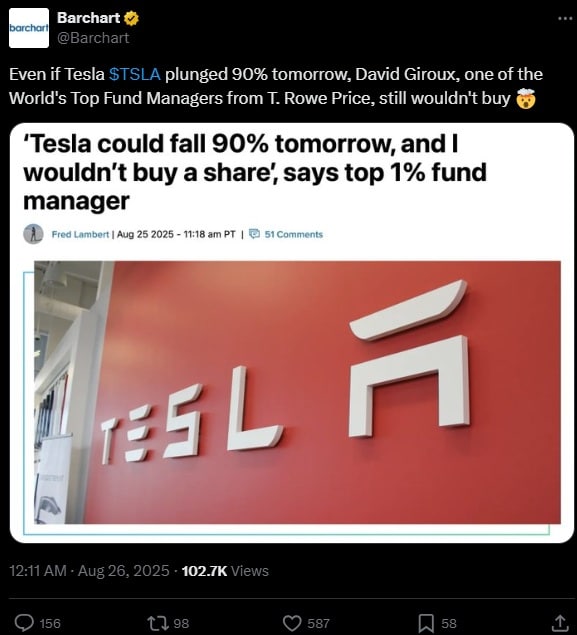 Jak stwierdził ekspert: „Jutro akcje Tesli mogą spaść o 90%. Ja bym nie kupował tych akcji, bo są po prostu szalenie przewartościowane„. Giroux uzasadnia swoje stanowisko tym, że w ostatnich miesiącach spółka borykała się ze spadkiem sprzedaży na dużych rynkach, takich jak USA. Analityk obawia się również rosnącej konkurencji, szczególnie ze strony Chin. Ekspert jest również umiarkowanym optymistą co do rozwoju projektu Robotaxi, który pod koniec czerwca oficjalnie zadebiutował.