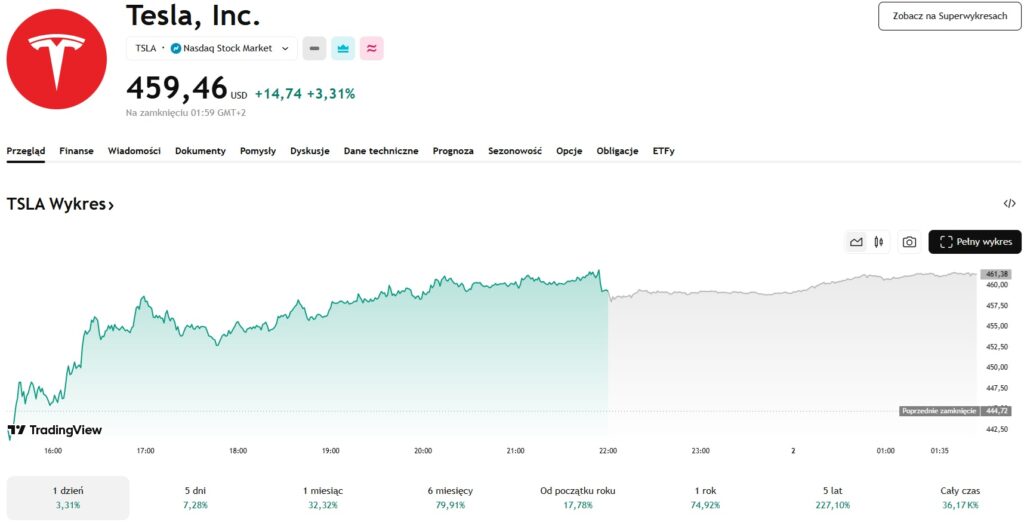 Jednak w ostatnich tygodniach sytuacja odwróciła się na korzyści giganta. Od krytycznego momentu akcje TSLA wzrosły o blisko 50%. W chwili pisania tekstu akcje giganta kosztują 459 USD i tylko w ciągu ostatnich 24 godzin zyskały 3,31%. Z kolei przez ostatni tydzień i miesiąc wzrosły odpowiednio o 7,28% oraz 32,32%. Pomimo długich miesięcy kryzysu spółka odwróciła negatywny trend, a wskaźnik YTD (Year To Date) zaczął pokazywać dodatni wynik. Od początku roku Tesla zyskuje na wartości 17,78%.