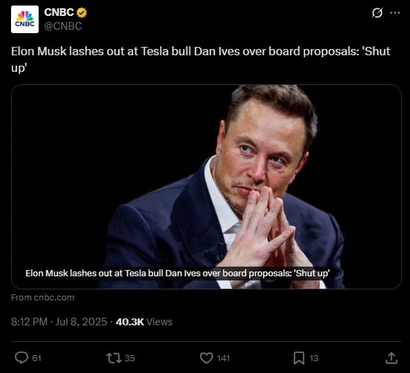 Aktualnie sytuacja na rynkach finansowych jeszcze nie jest dramatyczna, ale powoli zaczyna się robić nerwowo. Powodem jest powrót kwestii ceł handlowych. W tym tygodniu mija termin zawieszenia ceł między poszczególnymi państwami. Już w poniedziałek Donald Trump opublikował zaktualizowaną listę nowych stawek celnych. Mniejsze państwa raczej się uginają, ale na ustępstwa z Pekinu i Brukseli raczej nie ma co liczyć. W tym czasie kierownictwa większości spółek robią wszystko, by oddalić zagrożenia wewnętrzne i skupić się na zwalczaniu ewentualnych zewnętrznych problemów. Jednak niektórzy sami rzucają sobie kłody pod nogi. W ostatnim czasie Tesla, a właściwie sam Elon Musk, pomimo wyraźnych sygnałów, wykonuje ruchy, które rynek odbiera negatywnie.