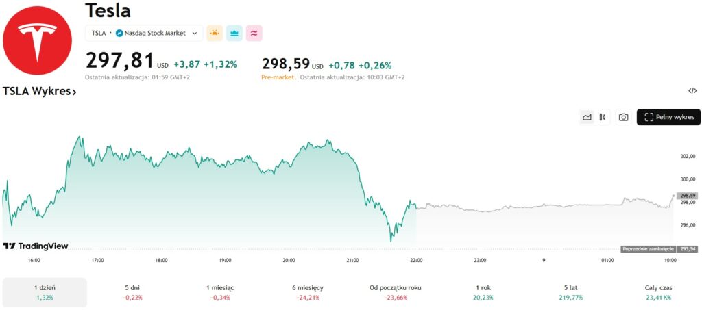 W tym tygodniu akcje TSLA spadły poniżej psychologicznej bariery 300 USD. W momencie pisania tekstu akcje giganta kosztują na giełdzie 297 dolarów, a w ciągu ostatnich 24 godzin wzrosły o 1,32%. Przez ostatni tydzień i miesiąc spadły odpowiednio o 0,22% oraz 0,34%. To nie wygląda jeszcze dramatycznej, ale realne problemy ujawnia wskaźnik YTD (Year To Date). Od początku roku akcje Tesli straciły na wartości 23,66%.