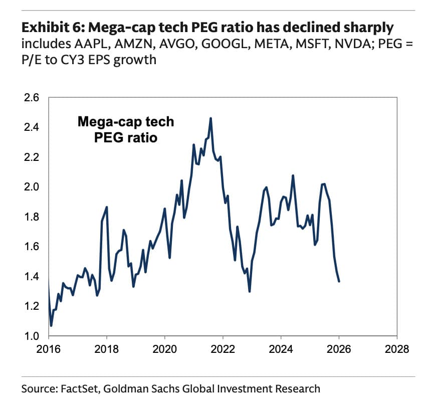 Co więcej, po szybkiej korekcie na największych firmach amerykańskich, które w niektórych przypadkach notowane są wciąż ok. 15 do 20% poniżej ATH (m.in. Meta Platforms, czy Nvidia), wskaźnik ceny akcji do oczekiwanych zysków mocno spadł. Wskaźnik PEG służy do wyceny akcji, i porównuje wskaźnik c/z z oczekiwanym tempem wzrostu zysków spółki w przyszłości (zwykle 1-3 lata).