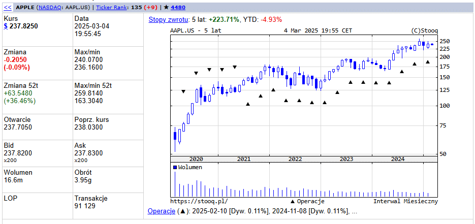 Mimo wszystko, spore emocje inwestorów wciąż wywołuje największa pozycja Berkshire Hathaway, czyli udziały w firmie Apple. Z ostatnich informacji wynika, że choć Buffett dokonał znaczących transakcji w innych spółkach (np. zmniejszenie zaangażowania w DaVita czy dokupienie akcji Occidental Petroleum), to jak dotąd przestał redukować pakiet w Apple. Pojawia się więc pytanie: jak poradził sobie Apple od początku 2025 roku i ile byłby wart tysiąc dolarów (równowartość ~4000 polskich złotych) zainwestowany wówczas w tę spółkę?