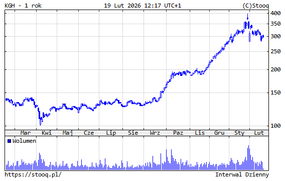 ChatGPT: KGHM w drugiej połowie lutego 2026 jest w ciekawym, ale wymagającym punkcie: z jednej strony spółce sprzyja bardzo wysoka cena miedzi (po styczniowych rekordach), z drugiej – kurs akcji zdążył wejść w korektę po silnym rajdzie z 2025 r. Obecnie KGHM jest notowany w okolicach ~297–302 zł.