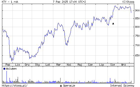 Na koniec dzisiejszej sesji za jedną akcję spółki trzeba było zapłacić 887 zł. Względem poprzedniego zamknięcia oznacza to spadek o niemal 3 proc. Warto zaznaczyć, że w ciągu dnia kurs tracił nawet więcej. W ciągu kilku dni kurs zaliczył zauważalny zjazd. Trzeba jednak spojrzeć szerzej na ten obraz. Okaże się wówczas, że kurs miał z czego oddawać. Pod koniec ubiegłego tygodnia za jedną akcję firmy Kęty płacono 926 zł, we wrześniu na liczniku było nawet powyżej 940 zł. Ale jeszcze na początku roku za jeden papier płacono niewiele ponad 680 zł. Notowania poszły w tym czasie do góry o ponad jedną trzecią. Na początku dekady jedną akcję można było kupić nawet poniżej 300 zł.