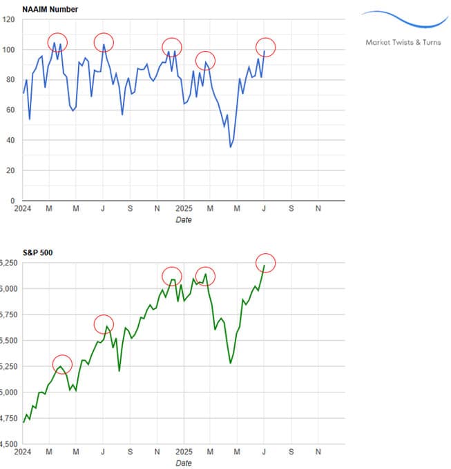 Wskaźnik NAAIM mierzy poziom zaangażowania zarządzających funduszami w rynek akcji. Wynik bliski 100% sugeruje, że niemal wszyscy są maksymalnie ustawieni „na wzrosty” – innymi słowy, większość rynku gra ofensywnie, bez większych zabezpieczeń. Historia pokazuje, że takie momenty często poprzedzają lokalne szczyty cenowe – czyli punkty zwrotne, po których indeksy zaczynają spadać.