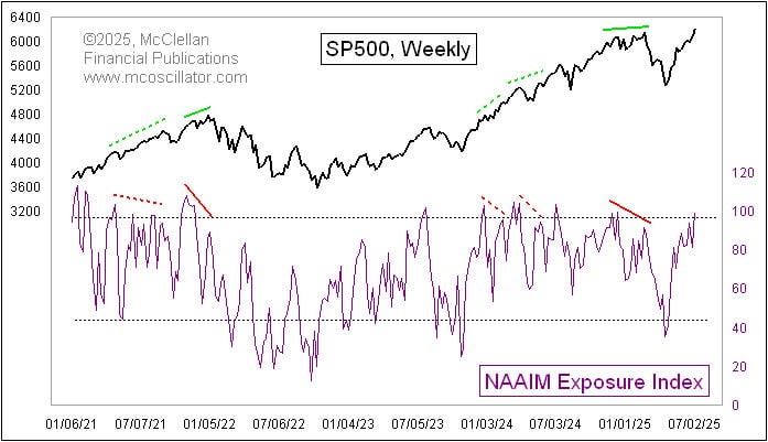 Warto przy tym zaznaczyć, że najlepsze sygnały ostrzegawcze pojawiają się wtedy, gdy dochodzi do tzw. dywergencji – czyli sytuacji, w której indeksy giełdowe nadal rosną … Ale wskaźniki sentymentu, takie jak NAAIM, zaczynają spadać. To oznacza, że „smart money” powoli opuszcza pokład. Tyle że tym razem tej dywergencji jeszcze nie ma. Zatem zarządzający wciąż są mocno „w grze”.
