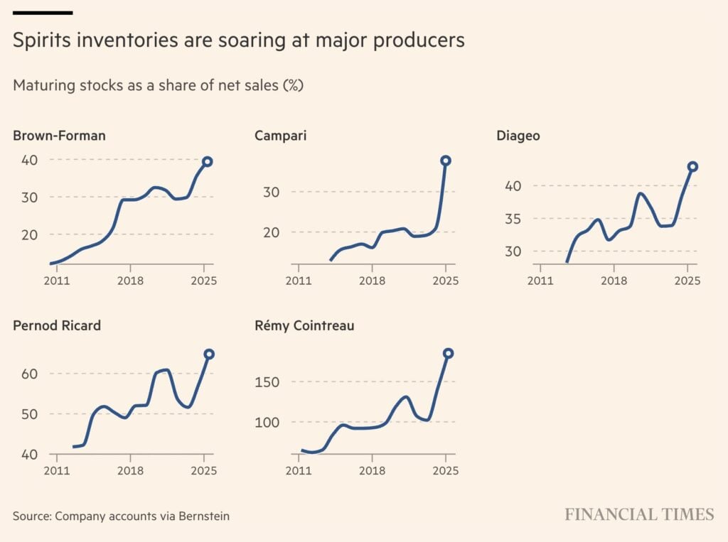 Pięciu największych notowanych producentów alkoholi: Diageo, Pernod Ricard, Campari, Brown-Forman i Rémy Cointreau posiada dziś łącznie około 22 mld dolarów zapasów dojrzewających alkoholi, co stanowi najwyższy poziom od ponad dekady. To nie są zapasy, które można szybko „przepchnąć” promocją.