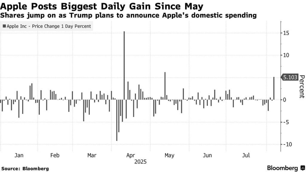 Tim Cook i Trump ogłosili umowę, która jednocześnie wzmacnia amerykańską gospodarkę i daje Apple ulgę od ryzykownych ceł. Efekt na rynku był natychmiastowy. Akcje giganta skoczyły błyskawicznie i kontynuują zwycięską passę. Jim Cramer wskazał, że sektor technologiczny wręcz rośnie na fali Apple, gdzie optymizm wywołuje 'pozytywny efekt domina’.