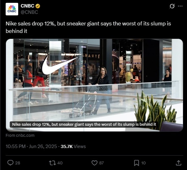 Najnowsze dane dotyczące sprzedaży i prognoz dla Nike zaniepokoiły część ekspertów i posiadaczy akcji spółki. Sprzedaż Nike spadła do 11,10 mld dolarów. To spadek o ok. 12% w porównaniu do wyników z zeszłego roku. Wówczas sprzedaż wygenerowała 12,61 mld dolarów. Z kolei przychody Nike Direct, obejmujące sklepy, hurtownie i stronę internetową, spadły o 14%. Ponadto najnowszy raport kwartalny ujawnił spadek sprzedaży aż o 86%. Te dane spowodowały, że krach stał się scenariuszem, który zaczął być brany pod uwagę przez część obserwatorów.