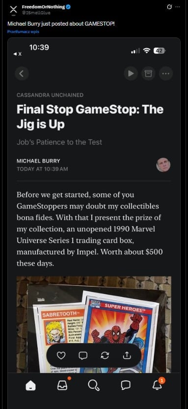 Burry, ukrywając się pod pseudonimem 'Cassandra Unchained’ poinformował: ’Posiadam GME. Ostatnio kupowałem. Spodziewam się, że kupuję po cenie, która wkrótce może wynosić 1-krotności namacalnej wartości księgowej / 1-krotności wartości aktywów netto. I dostaję młodego Ryana Cohena, który inwestuje i alokuje kapitał oraz przepływy pieniężne spółki. Być może na następne 50 lat.