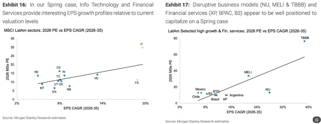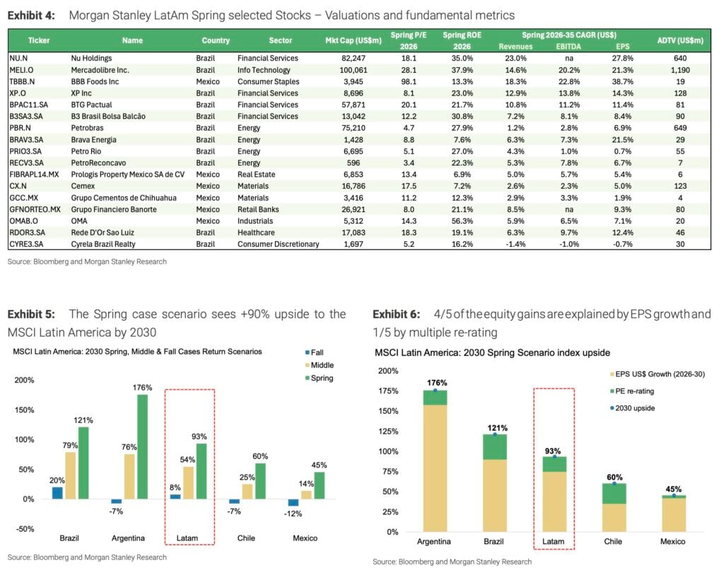 Morgan Stanley prognozuje, że rynki akcji w Ameryce Łacińskiej mogą doświadczyć nawet 90% wzrostu MSCI Latin America do 2030 roku, przy średniorocznej stopie wzrostu zysku na akcje na poziomie 18 procent w USD. Analitycy banku podkreślają, że większość potencjalnych zysków będzie napędzana realnym wzrostem zysków spółek… A tylko w mniejszym stopniu rewaluacją wycen. Nowy klimat makroekonomiczny w regionie… Od bardziej przyjaznej polityki inwestycyjnej po coraz bogatszych inwestorow indywidualnych. To stwarza przestrzeń do inwestycji w spółki o wysokiej dynamice wzrostu.