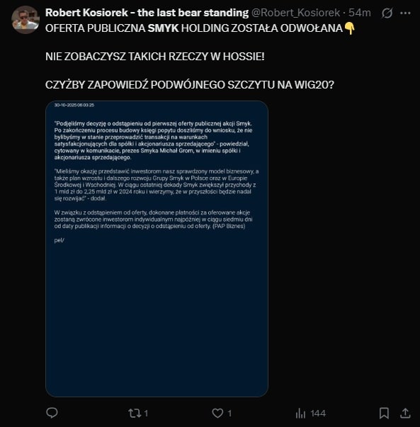 Jak wynika z oficjalnego komunikatu firmy, osoby, które już dokonały płatności za oferowane akcje, otrzymają zwrot środków. Smyk nie wyklucza również, że w przyszłości wróci do tego pomysłu i ostatecznie zadebiutuje na giełdzie. Na ten moment firma podkreśla, że choć debiutu nie będzie, to miała okazje, by przedstawić inwestorom swój modeli biznesowy oraz plan rozwój na przyszłość.