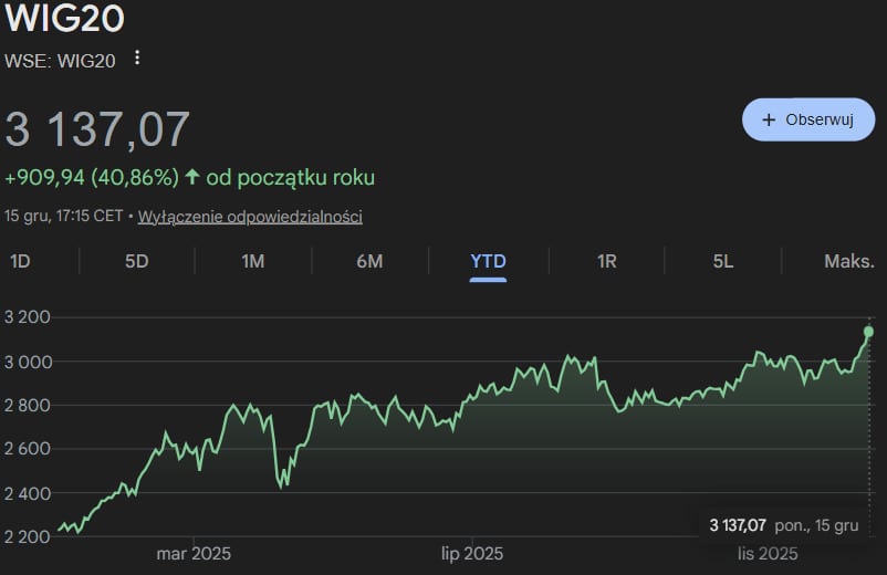 Dziś wśród spółek z WIG20 jednym z najmocniejszych walorów był Budimex. Spółka może zarobić na kontraktach infrastrukturalnych związanych z potencjalną odbudową Ukrainy. Poza perspektywą pokoju, polskim spółkom sprzyjają też wzrosty cen akcji KGHM, który korzysta z rekordowego rajdu cen srebra. Kruszec ma za sobą ponad 120% wzrost w tym roku.