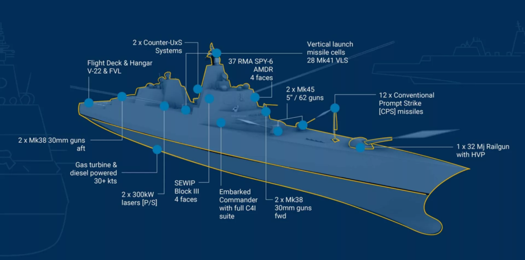 Okręty będą wyposażone w pokład lotniczy i hangar zdolne do obsługi przemiennowzlotów V-22 Osprey oraz przyszłych statków pionowego startu i lądowania. Mają być też dostosowane do współpracy z powietrznymi i pływającymi bezzałogowcami. Uzbrojenie obejmie ponad 150 komór wyrzutni pionowego startu VLC, przenoszących pełną paletę istniejącej i opracowywanej broni rakietowej (w tym np. pociski hipersoniczne czy nuklearne pociski manewrujące), a także działa elektromagnetyczne (railguny), zaawansowaną artylerię klasyczną, lasery wysokiej mocy czy rakietowe systemy CIWS.