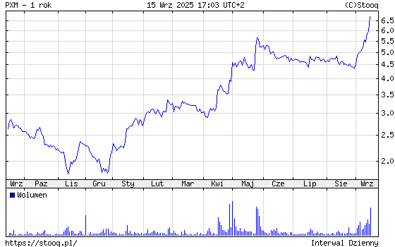 Wczorajsza sesja zamknęła się dla spółki z wynikiem przeszło 6,7 zł za akcję, tego dnia zanotowano wzrost o ponad 13 proc. Dzisiaj o poranku kurs wyglądał bardzo podobnie. Tymczasem jeszcze pod koniec sierpnia za jeden papier płacono 4,3 zł. W ciągu około dwóch tygodni notowania poszły do góry o ponad 55 proc. Jeśli ktoś uważa, że to mało, dodam, iż w listopadzie ubiegłego roku jedną akcję spółki Polimex Mostostal można było kupić za około 1,75 zł. W niespełna rok cena akcji wzrosła o ponad 280 proc.