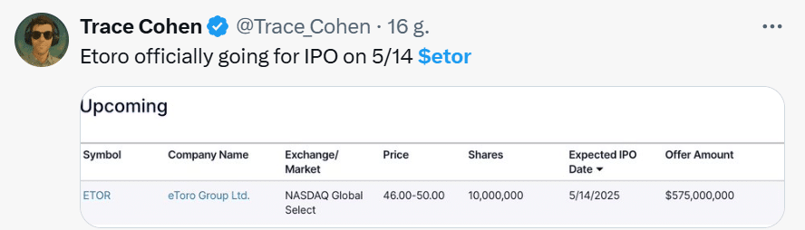 Kiedy firma handlująca krypto i akcjami ogłasza wejście na giełdę, to naturalnie wzbudza zainteresowanie całej branży. Ale eToro nie robi tego po cichu – oni robią to z przytupem i od razu celują wysoko. Właśnie złożyli papiery do amerykańskiej SEC, chcąc zadebiutować na Nasdaq pod symbolem „ETOR”. Cel? Zebrać 500 milionów dolarów i wycenić się nawet na 4 miliardy.