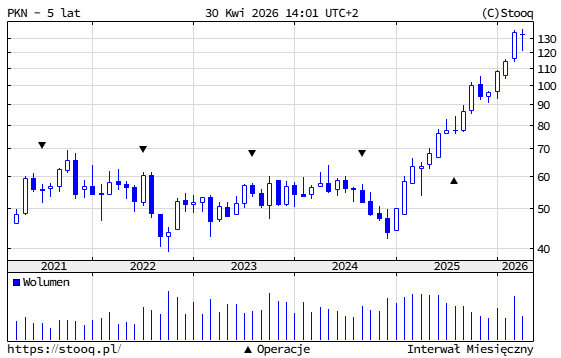 Zarząd Orlenu zarekomendował 29 kwietnia akcjonariuszom dywidendę w wysokości 8 złotych na akcję za rok 2025. To rekord w historii spółki i łącznie 9,3 miliarda złotych do podziału. Kurs akcji na informację zareagował natychmiast – w środowe południe rósł o 2,6 procent do 131,6 złotego.