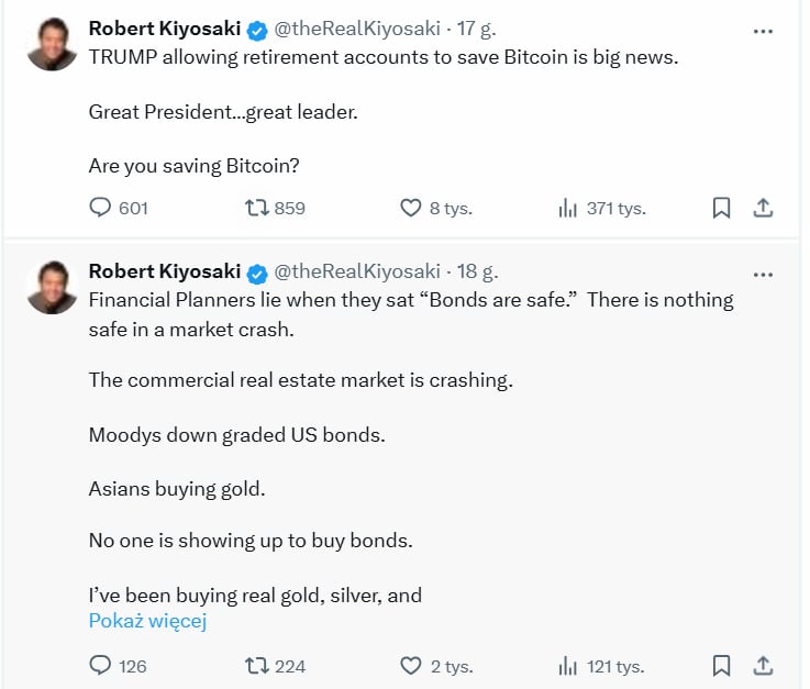 Robert Kiyosaki – znany ze swojej nieufności wobec systemu opartego na długu… Od lat powtarza, że w kryzysie wygrywają ci, którzy trzymają aktywa spoza papierowego świata. Złoto, srebro, ropa, bitcoin, a nawet… bydło. To nie jest poetycka metafora, tylko strategia kogoś, kto zakłada, że nadchodząca recesja a może i „nowa Wielka Depresja” … Będzie czasem największych transferów majątku w historii. Od tych, którzy wierzyli w broszury banków, do tych, którzy wierzyli we własny plan.