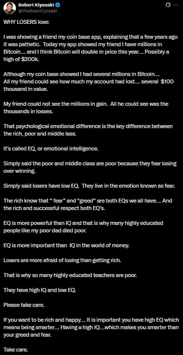 Najnowszy wpis Roberta Kiyosakiego, autora bestsellerów o finansach osobistych, ponownie przyciągnął uwagę inwestorów. W krótkim, ale treściwym tweecie Kiyosaki poruszył temat, który od lat jest kluczowy w jego filozofii. To óżnica między bogatymi a resztą społeczeństwa leży nie w IQ, a w inteligencji emocjonalnej, czyli EQ.