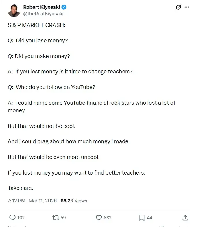 Stwierdził, że sam zdążył już zarobić na spadkach i stwierdził, że wielu znanych finansowych celebrytów z YouTube straciło fortunę. Zasugerował, by wszyscy uważnie patrzyli na to, jakich mają nauczycieli… Problem w tym, że jak zwykle – Kiyosaki daje zero konkretów, ani dowodów. Nie zmienia to faktu, żę dziesiątki tysięcy ludzi śledzą jego tweety.