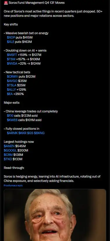 Czwarty kwartał nie był dla Soros Fund Management jedynie momentem wejścia w nowe historie. To również jedna z najbardziej aktywnych rotacji portfela ostatnich lat … Ponad 50 nowych pozycji i wyraźny sygnał, że fundusz nie tylko szuka wzrostu, lecz także konsekwentnie zarządza ryzykiem makro. Najmocniej rzuca się w oczy zdecydowany, wręcz agresywny hedging sektora energetycznego. Zakłady spadkowe na amerykańskie spółki naftowe i gazowe sięgnęły łącznie niemal 580 mln dolarów.