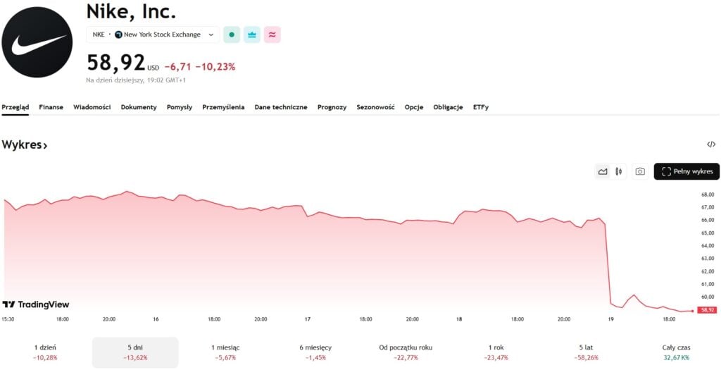 W piątek 19 grudnia akcje spółki były weceniane na 58 dolarów, choć jeszcze kilka godzin wcześniej były na poziomie prawie 67 dolarów. W ciągu zaledwie dobry gigant stracił na giełdzie około 10%. Ponadto w ujęciu tygodniowym strata wyniosła 13,62%. Natomiast w ujęciu miesięcznym gigant spadł o 5,72%. Bardzo mocno w dół w ostatnim czasie spadł również wskaźnik YTD (Year To Date). Od początku roku Nike traci na wartości ponad 20%.