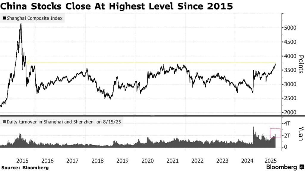 Obroty na giełdach kontynentalnych Chin sięgnęły w poniedziałek 2,7 bln juanów – to drugi najwyższy wynik w historii. Równocześnie chińscy inwestorzy kupili w Hongkongu akcje za blisko 4,6 mld dolarów. Atmosfera „risk-on” wyraźnie udziela się chińskim bykom.