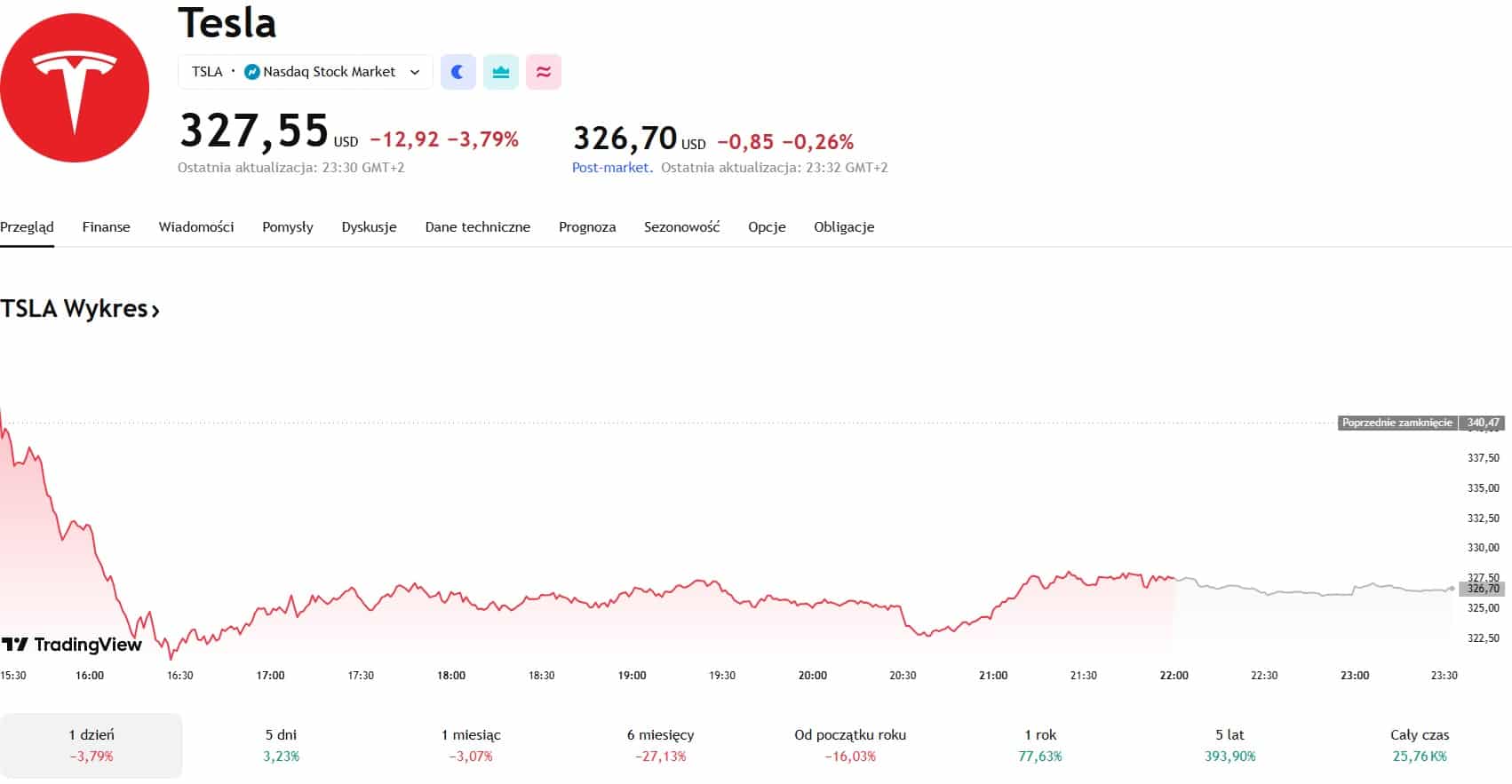 W momencie pisania tekstu akcje TSLA kosztują 327,55 USD, a w trakcie ostatnich 24 godzin spadły o 3,79%. Wynik za miniony tydzień pozostaje dodatni (3,23%). Jednak wyniki miesięczne ucierpiały i wynoszą na ten moment -3,07%. Od początku roku Tesla straciła na wartości 16,03%.