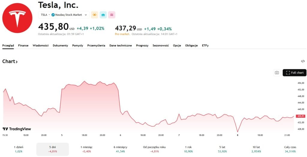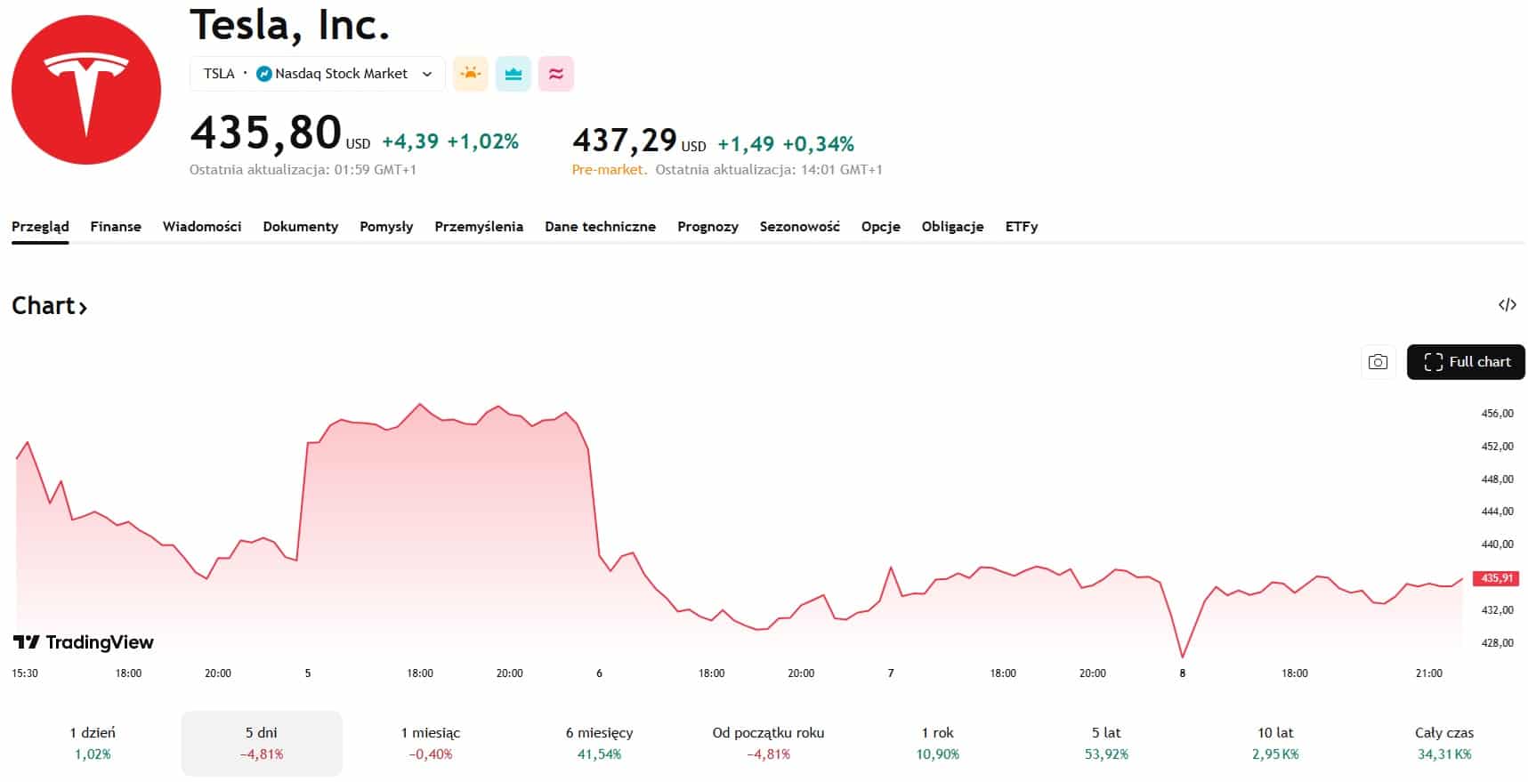 Spółka mocna odbiła, szczególnie w ostatnim kwartale 2025 rok. Jednak podobnie jak poprzednio, nowy rok rozpoczął się dla giganta sporym spadkiem. Pod koniec tygodnia akcje TSLA poruszały się w zakresie 426-439 dolarów. W trakcie całego poprzedniego tygodnia Tesla spadła o blisko 5%.