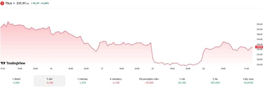 Jeszcze 17 grudnia Tesla, na której czele stoi Musk, osiągnęła cenę blisko 480 dolarów za akcje. Od tamtego momentu notowania giganta spadły o około 51%. W chwili pisania tekstu akcje Tesli kosztują 237 dolarów, a w ciągu ostatnich 24 godzin zyskały na wartości 4,60%. Przez ostatni tydzień spółka straciła 4,78%. Natomiast w trakcie ostatniego miesiąca wzrosła o 1,27%. Jednak licząc tylko od początku roku, straty wynoszą aż 39%. Akcje spółki zanotowały największy kwartalny spadek od 2022 roku.