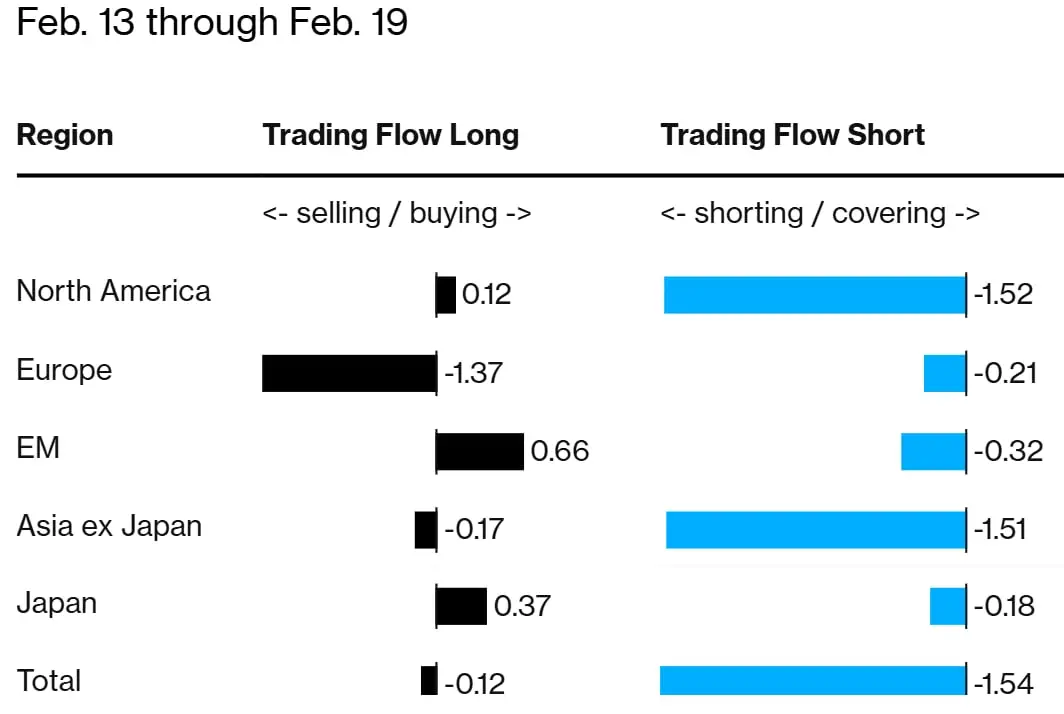 Dane pokazują, że wszystkie główne regiony zostały sprzedane netto. Największa presja dotyczyła Ameryki Północnej i Europy. W Ameryce Północnej dominowało agresywne zwiększanie krótkich pozycji, podczas gdy w Europie kluczowym czynnikiem była redukcja długiej ekspozycji.