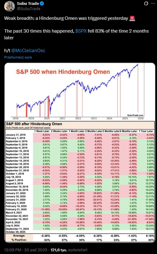 Wskaźnik Hindenburg Omen wczoraj, 29 października został aktywowany. Ale czym właściwie jest ten wskaźnik? To narzędzie, które ma sygnalizować potencjalne załamanie rynku, gdy spełnionych zostanie kilka warunków — m.in. gdy rynek znajduje się w trendzie wzrostowym, a jednocześnie duża liczba spółek notuje zarówno nowe roczne maksima, jak i minima w tym samym dniu, oraz gdy oscylator McClellana pokazuje wartości ujemne. Wskaźnik został stworzony w 1993 roku przez Jima Miekkę.